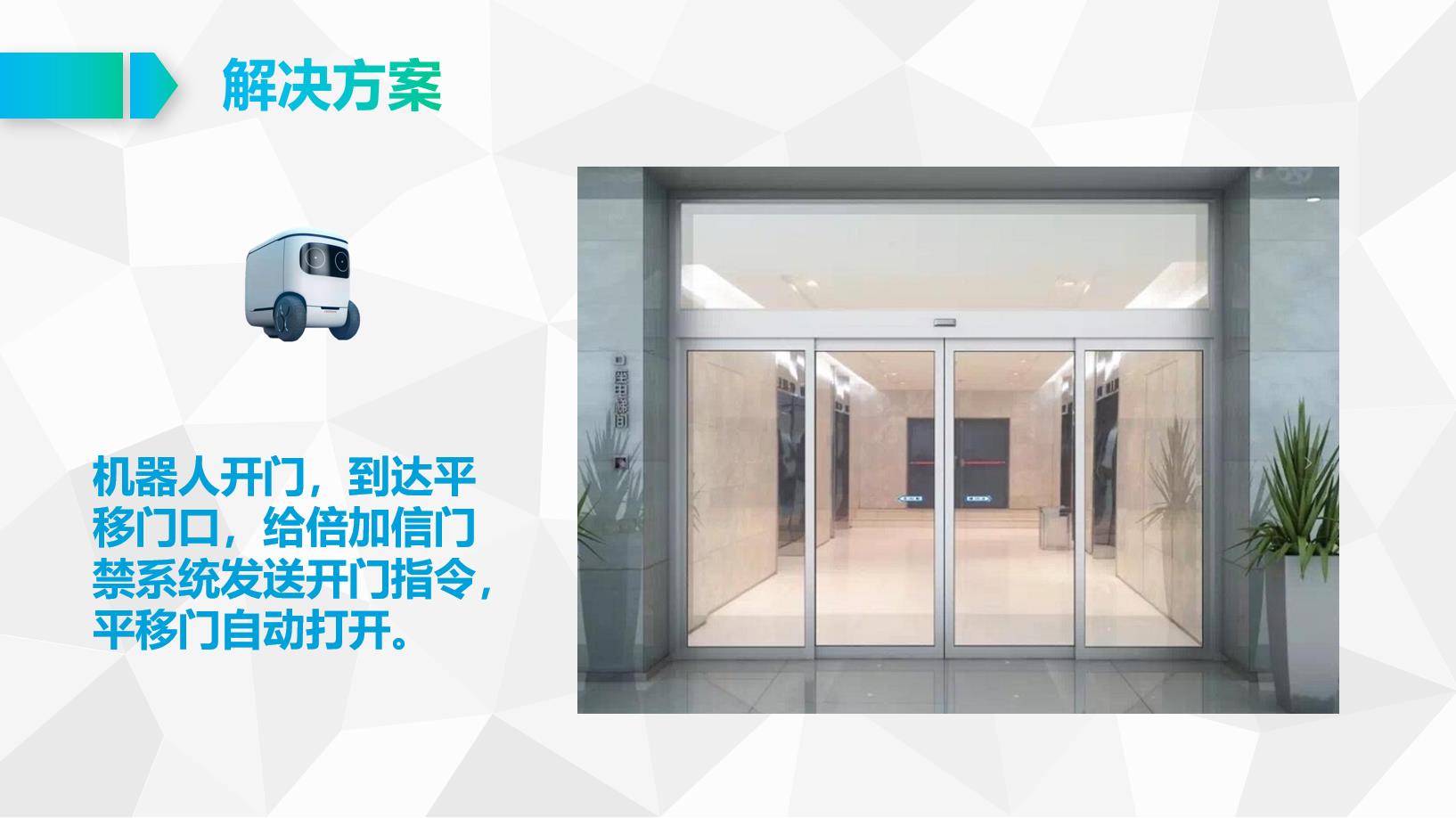 機(jī)器人開(kāi)門(mén),到達(dá)平移門(mén)口,給倍加信門(mén)禁系統(tǒng)發(fā)送開(kāi)門(mén)指令,平移門(mén)自動(dòng)打開(kāi)。