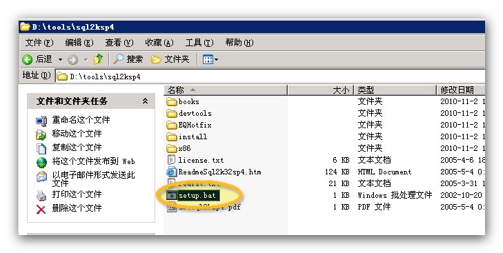 解壓sql2ksp4.rar這個(gè)壓縮包到當(dāng)前路徑,點(diǎn)擊setup.bat進(jìn)行安裝,注意很多人把解壓當(dāng)成安裝,解壓了并不是安裝,一定要注意,解壓后需要到解壓目錄下執(zhí)行安裝。